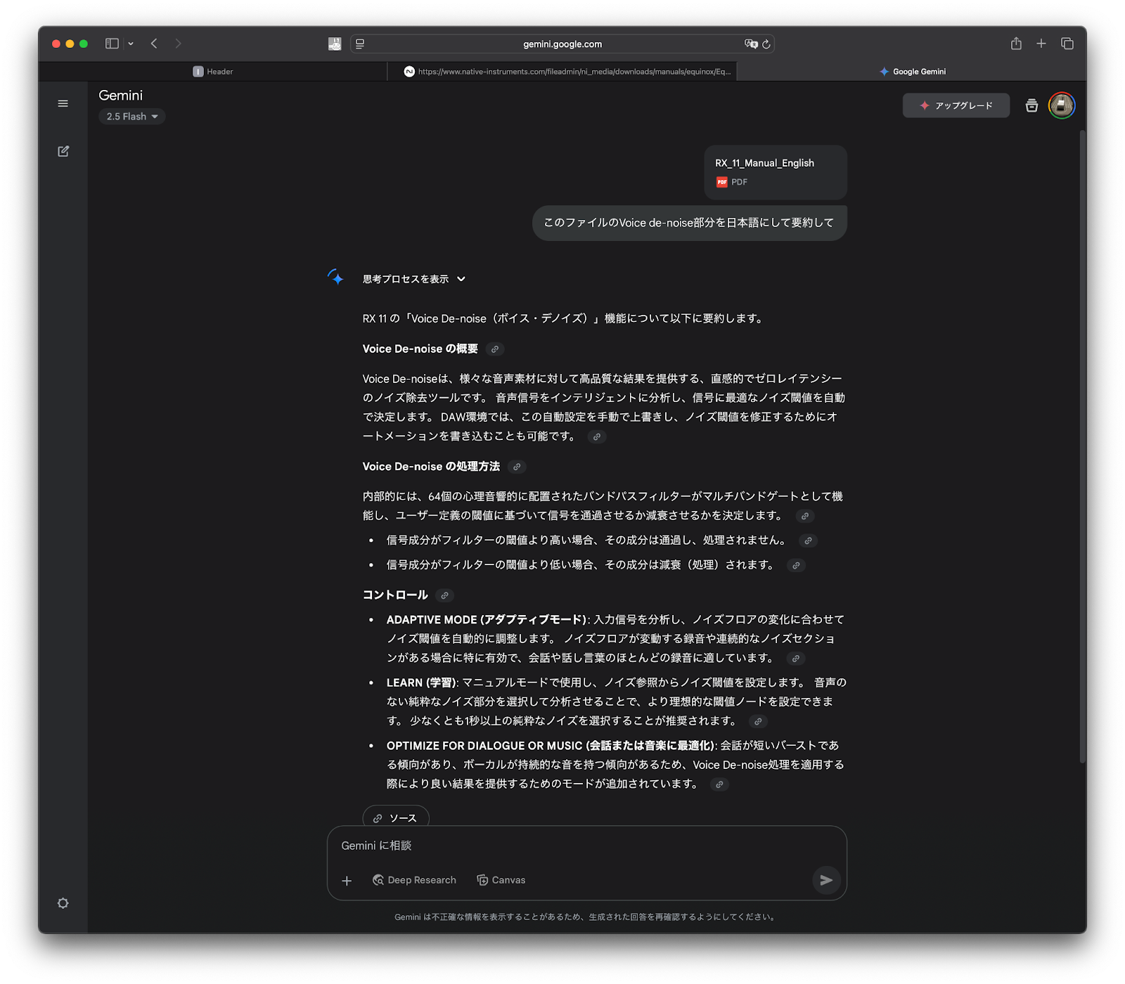2.「このファイルのVoice de-noise部分を日本語にして要約して」と入力する