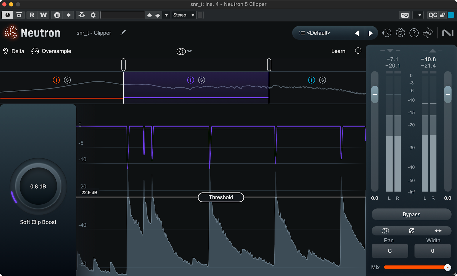 Clipperモジュールでは最大3バンドに分けたクリッピングが行える他ソフトクリッピングさせることでピークレベルを保ったままより信号の平均レベルを高めることができます。ビフォーアフターを比べると、ピークレベルが変わらないまま音量感が増していることがわかります。