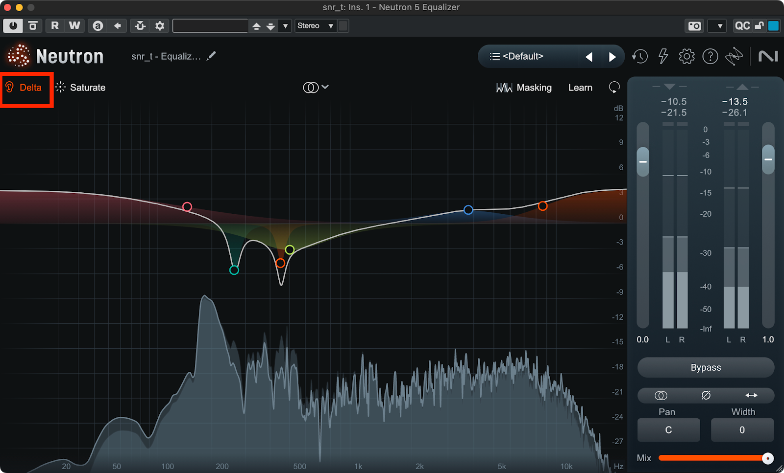 Neutron 4 Equalizerで上記のEQと同じカーブを書いた場合の様子。横軸のスケールが調整されて見たい部分の情報が大きく見えるように。
