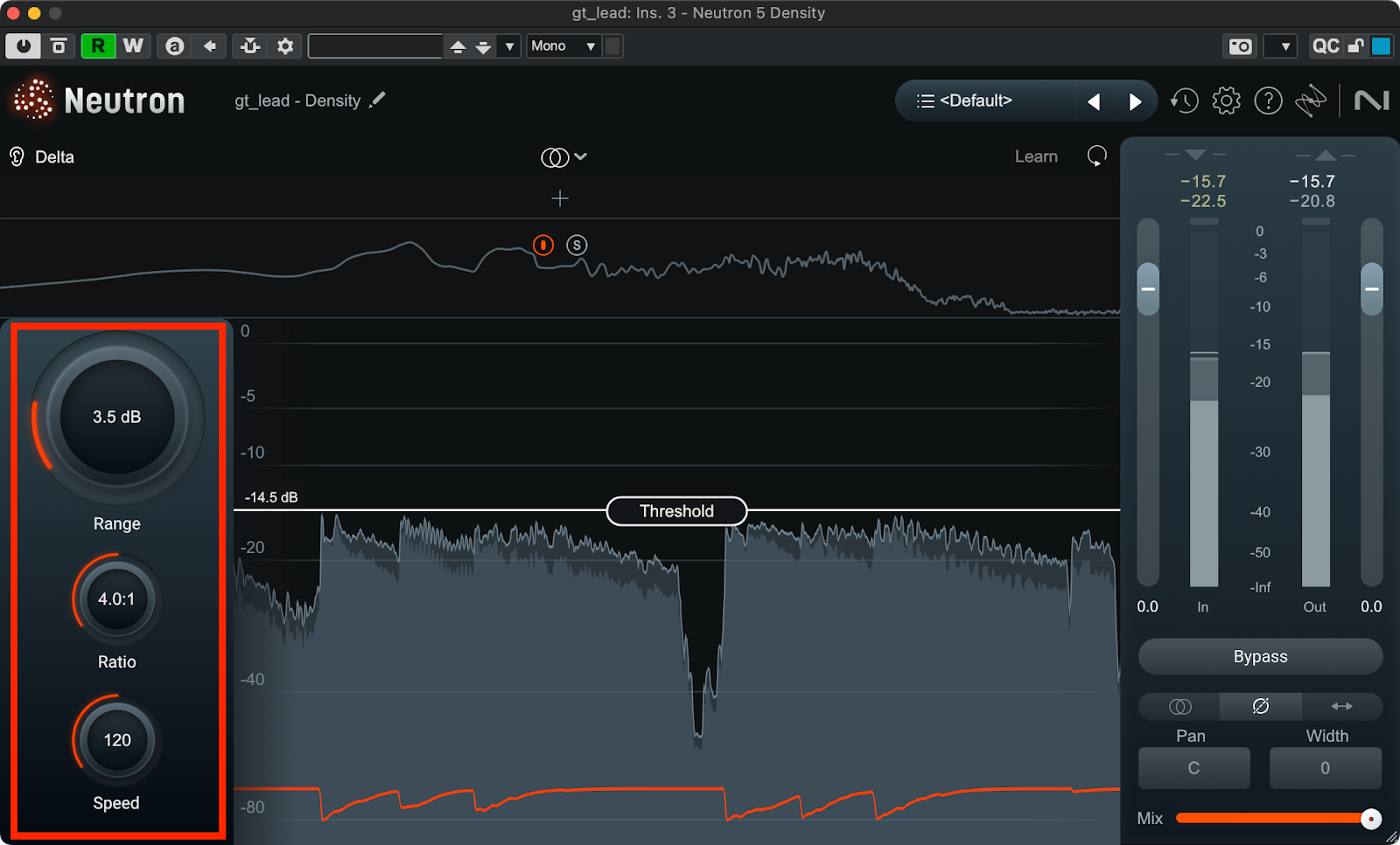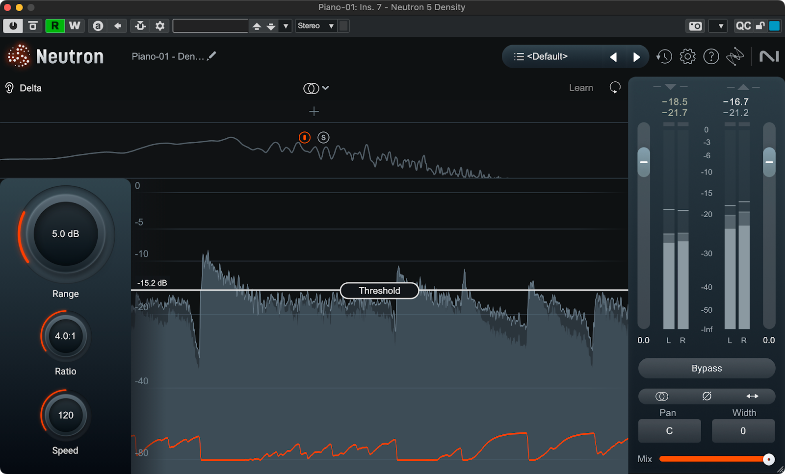 2つ目がDensityモジュールです。これはUpward Compressionに特化したモジュールで、Thresholdを下回る成分を最大でRangeの値の分だけブーストすることでアタックの質感に影響を与えることなく信号のダイナミックレンジを狭めることができます。Upward Compression自体はOzoneのMaximizerでも使用されている技術ですが、こちらはよりミックスで使いやすいようにレンジやアタック、リリースが細かく変更できるようになっています。