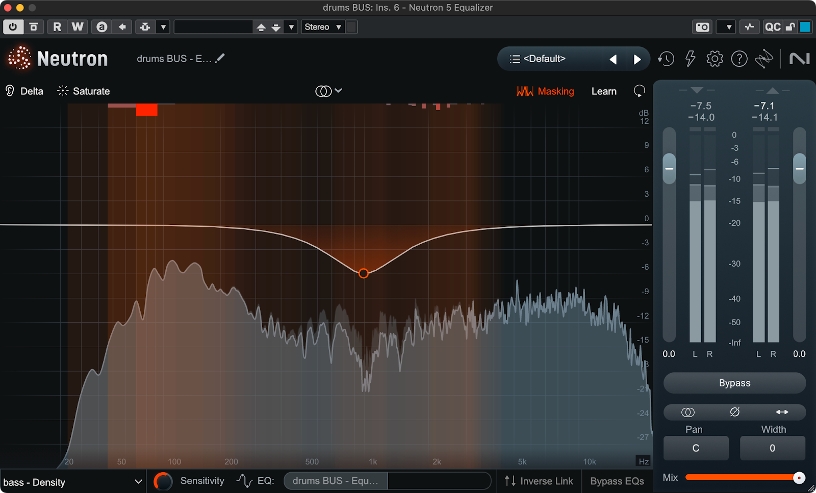 マスキングメーターはトラック間で起きている特定周波数帯の成分の干渉を可視化する機能で、要するに「オレンジで表示された箇所ではいずれの楽器の成分も聞き取りづらくなっていますよ」というのをEQモジュール自身が教えてくれるものです。