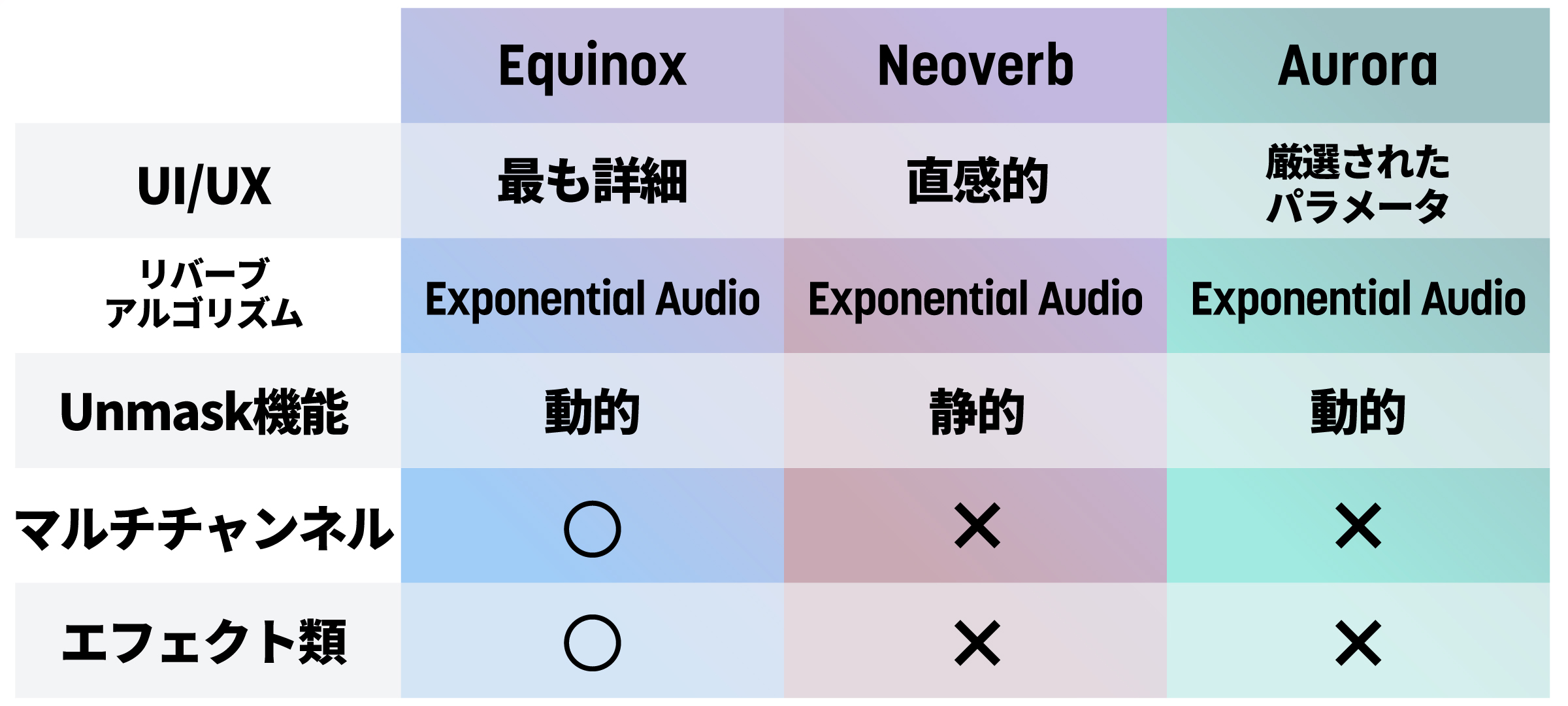 EquinoxとNeoverb(ついでにAuroraも)の違いを若干無理やりですが表にまとめてみました。どのシチュエーションでどれを選ぶか、選択の一助になれば幸いです。