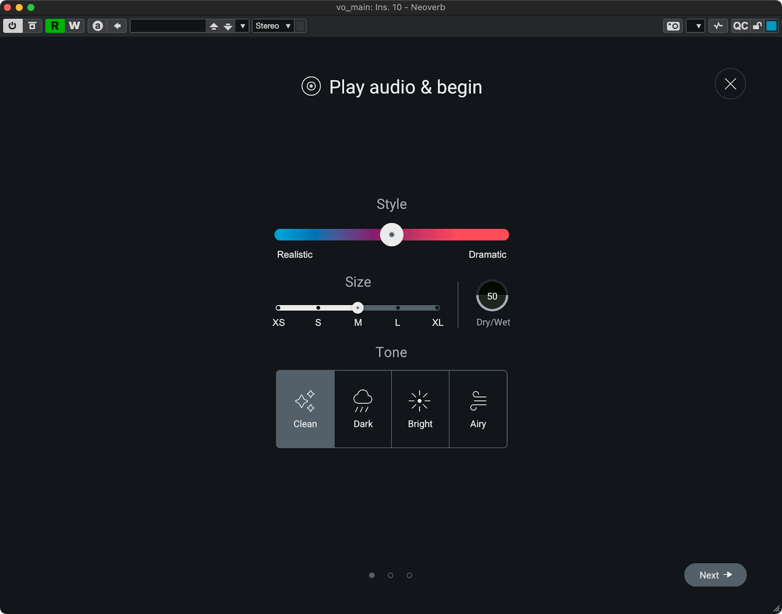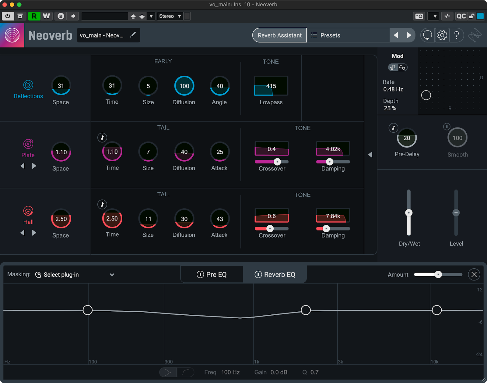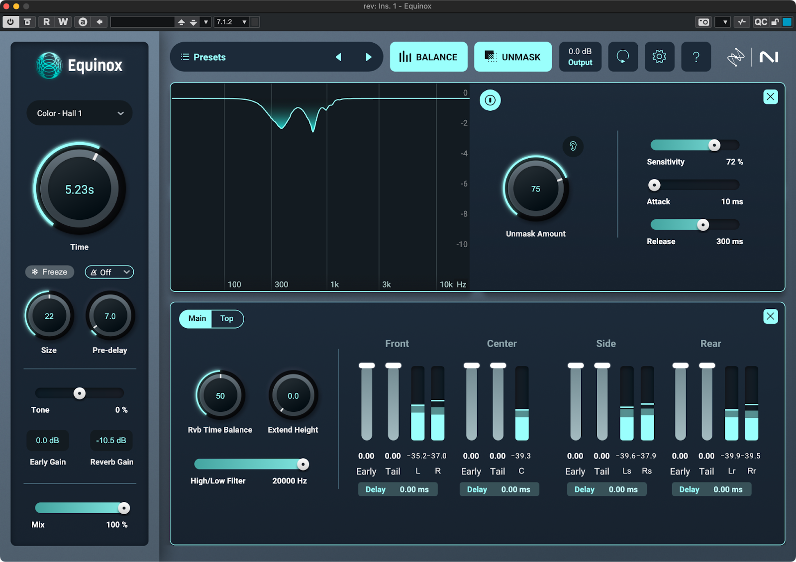 Reverb Assistantでは、従来のリバーブのようなリバーブタイム、プリディレイといったパラメータでリバーブをデザインするのではなく「長い/短い」「明るい/暗い」「リアル寄り/演出寄り」と言った形容詞的なパラメータに従って音作りできる他、リバーブが邪魔になってしまう帯域を自動的に検出してカットしてくれる機能もあります。