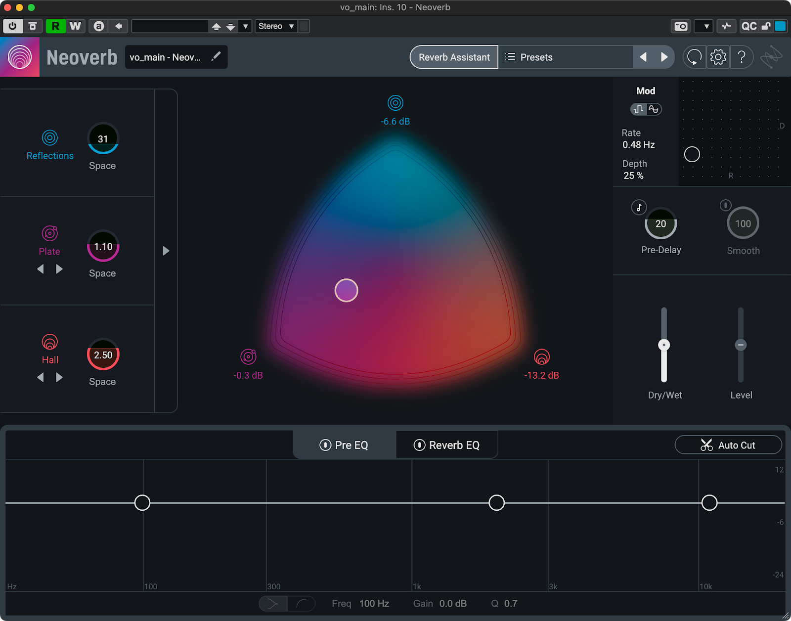 Reverb Assistantの画面。難しいことを考えずにリバーブの音色を決めることができる。