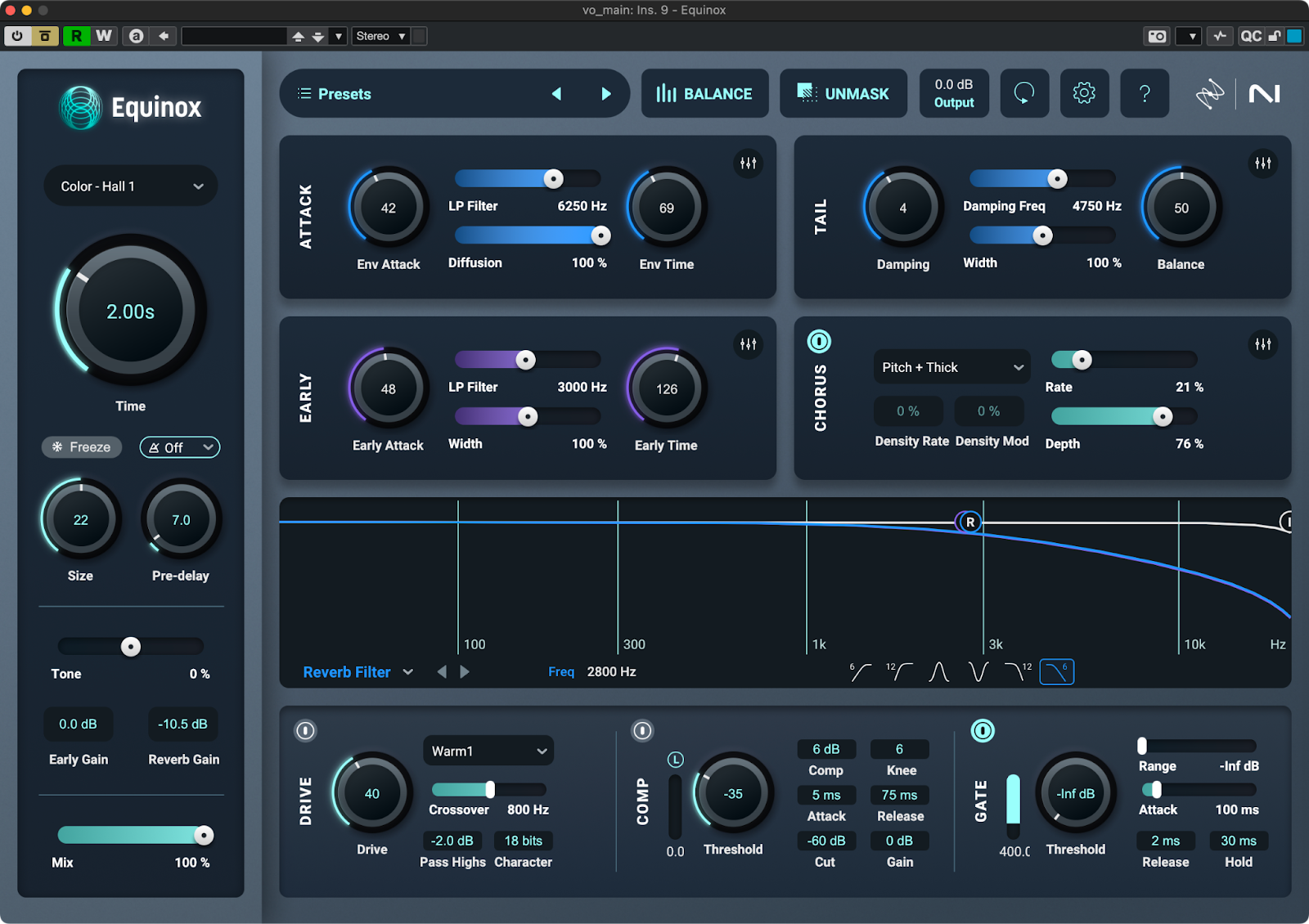 一方Equinoxはあらゆる細かなパラメータにアクセスしてリバーブを作り込みやすいUIになっており、事実非常に細かくリバーブの音色を作り込むことができます。