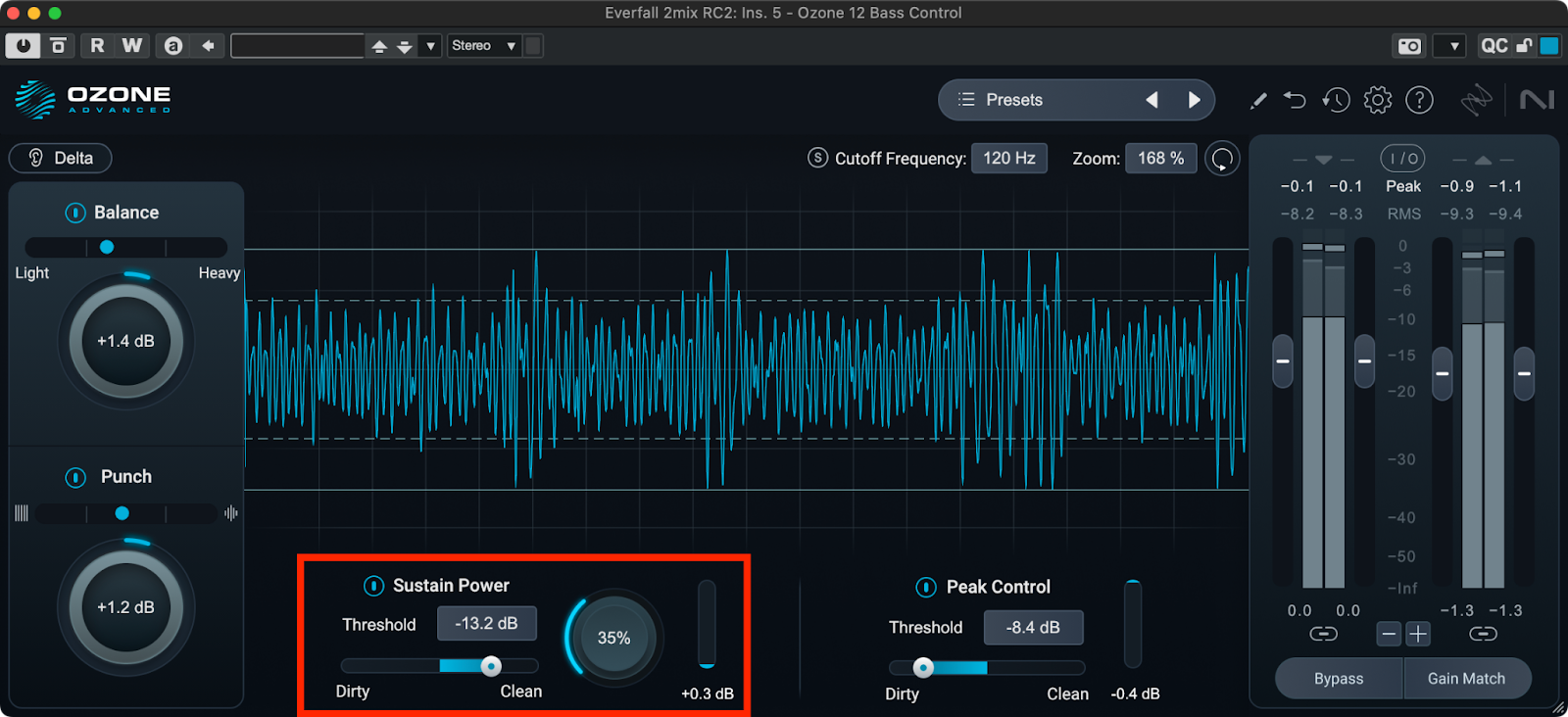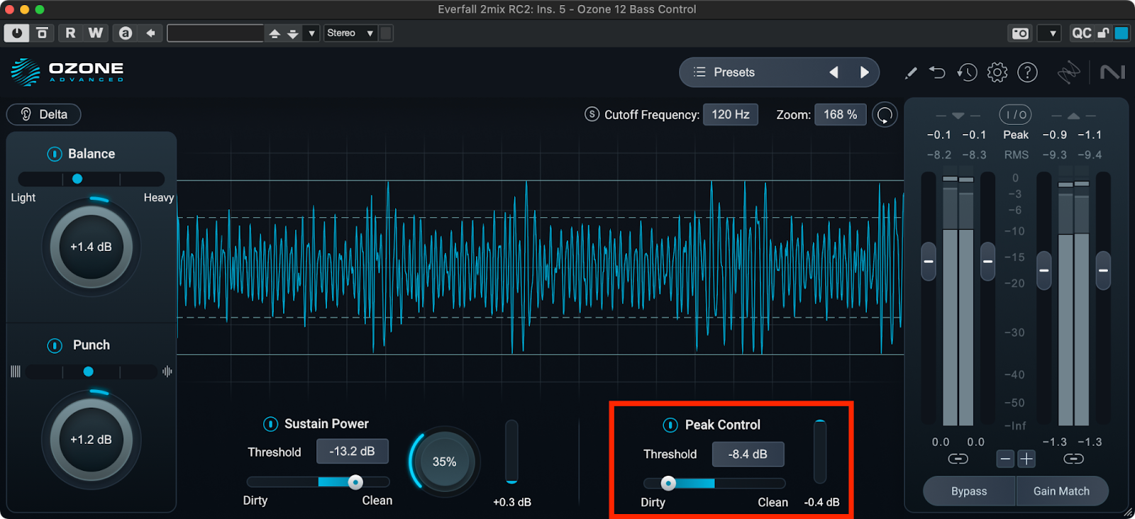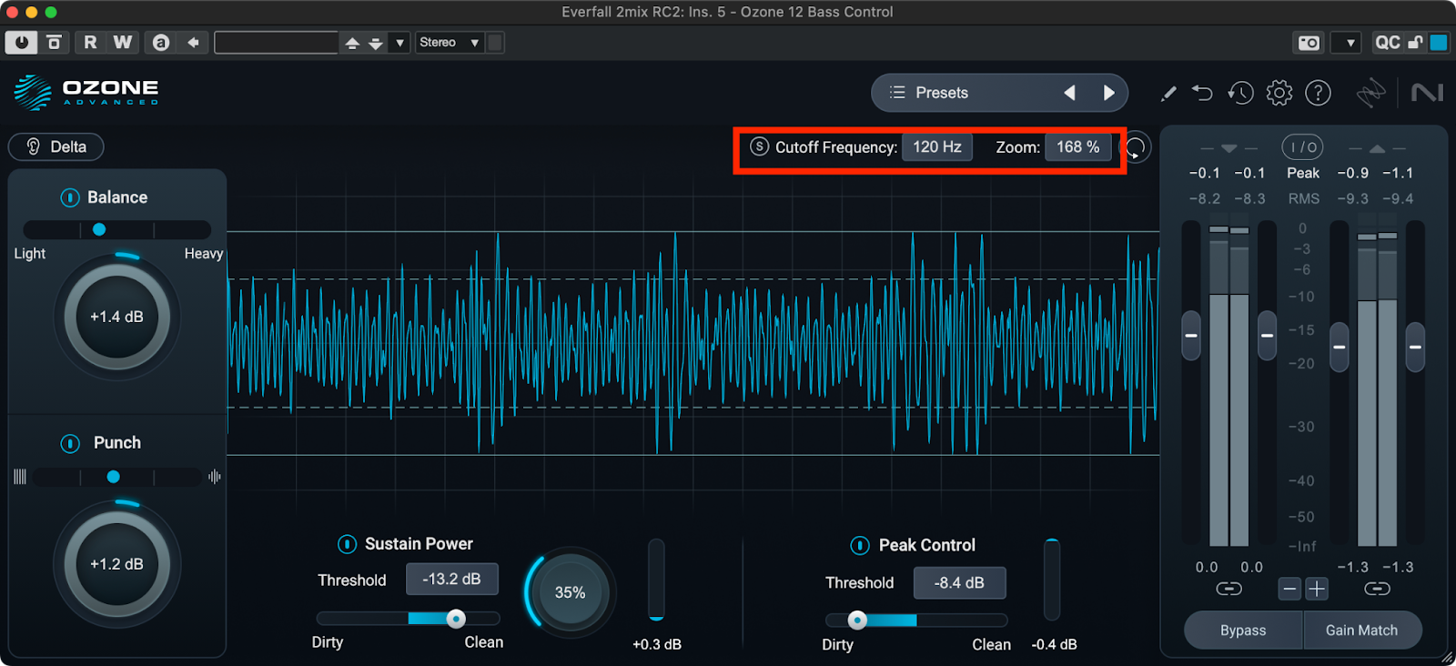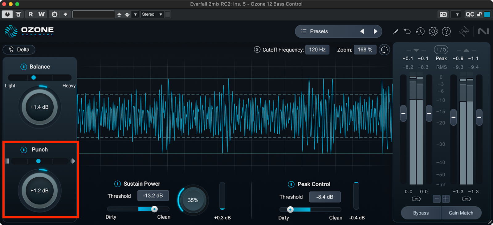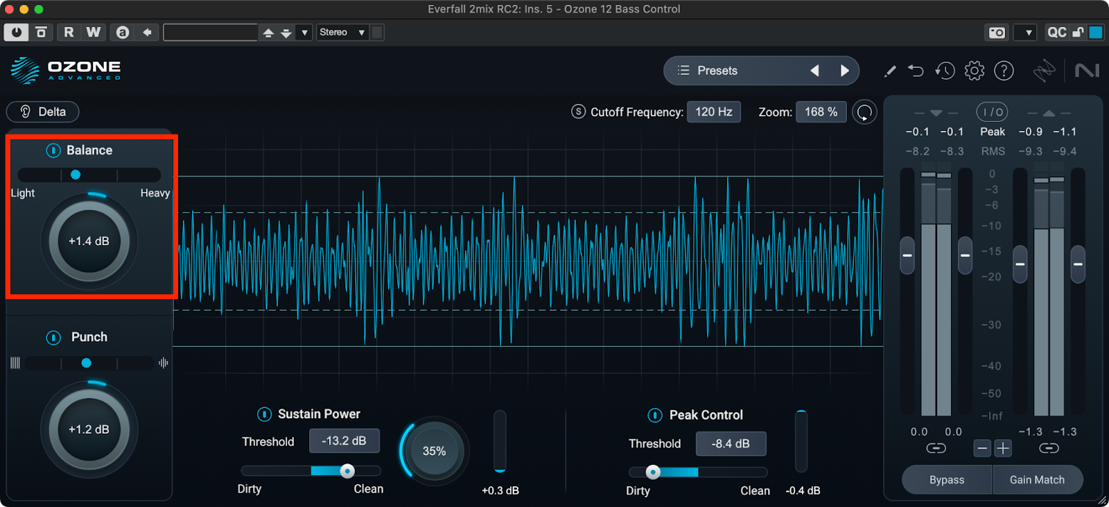 Bass Controlをインサートしたら、まずBalanceとPunchに注目してみましょう。Balanceでは低域のレベルを増減させます。低域の軽さ、重さはすぐ上の表示で確認することができます。