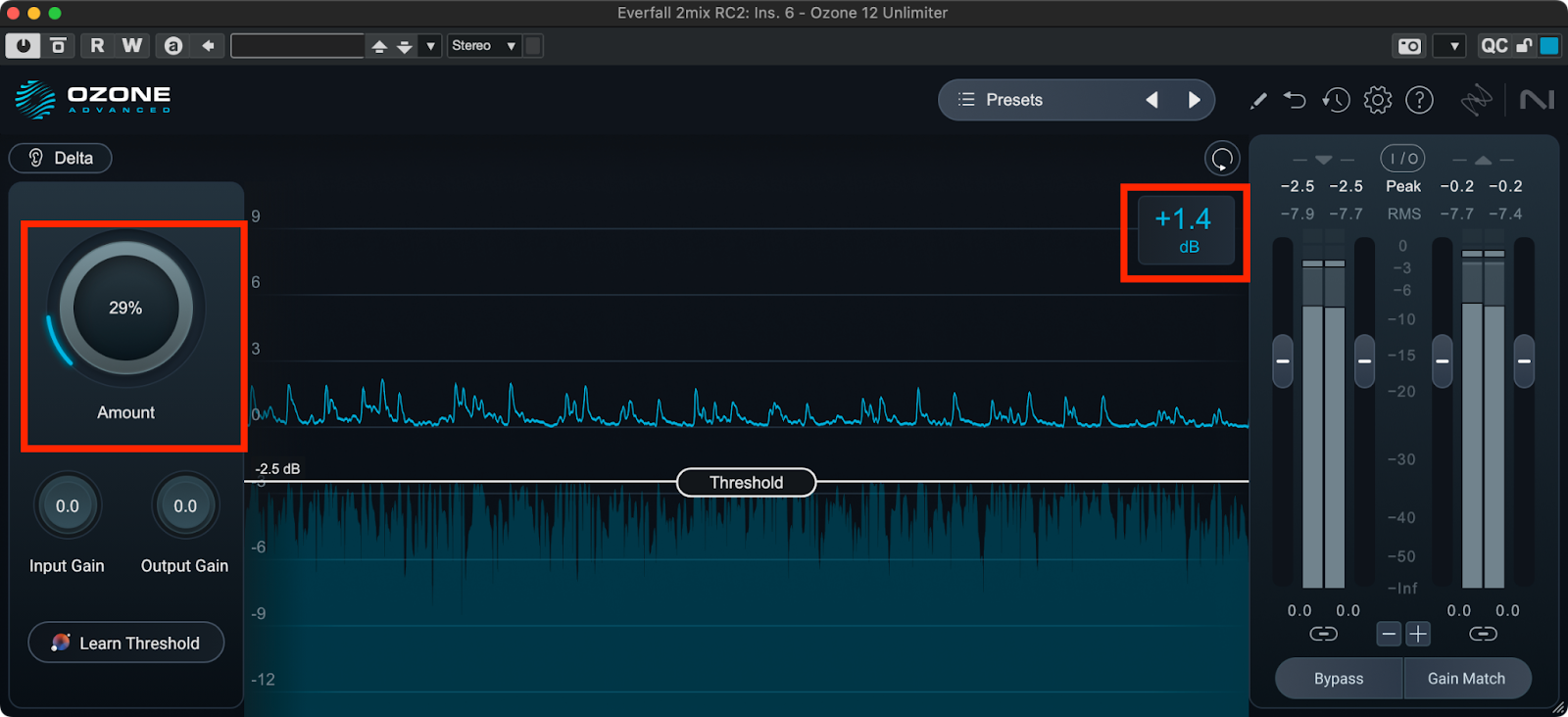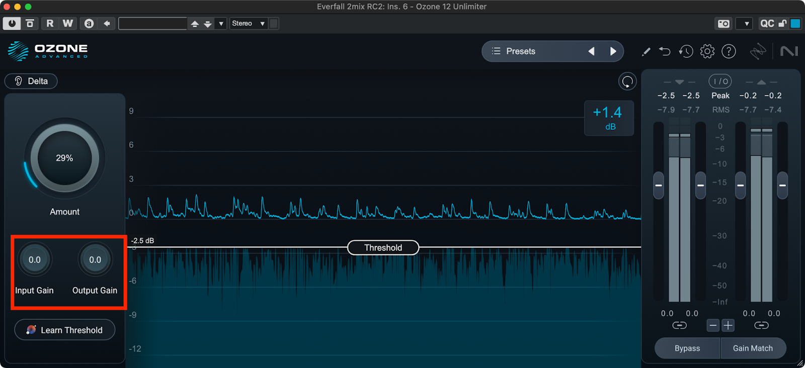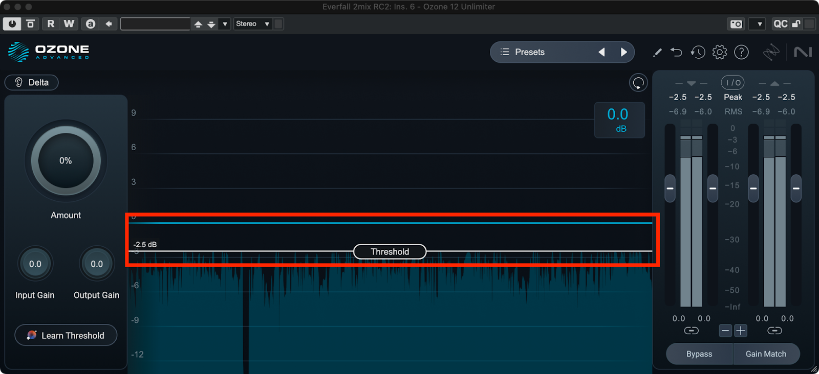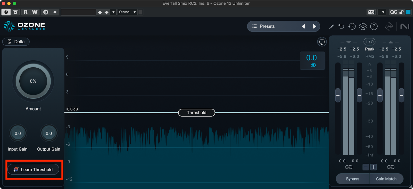 Learn Thresholdボタンをクリックしてからトラックを再生し、リミッティングがかかっているピークレベルまでThresholdを移動させます。