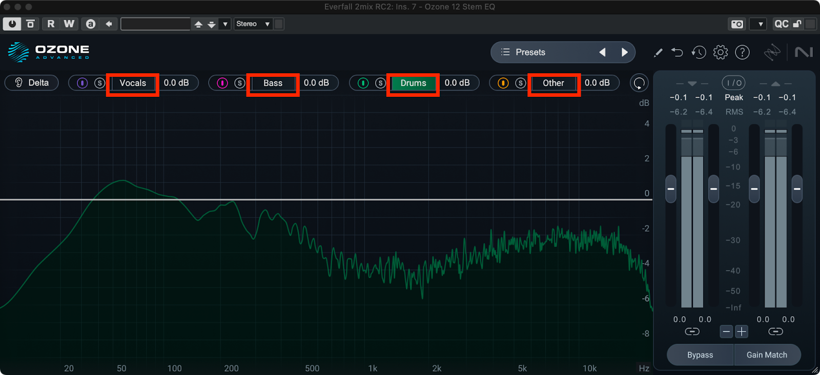 Stem EQを使えば、通常のEQと同じ感覚でミックス済の波形の中のボーカル、ベース、ドラム、その他の楽器のみに対してEQを施すことができます。