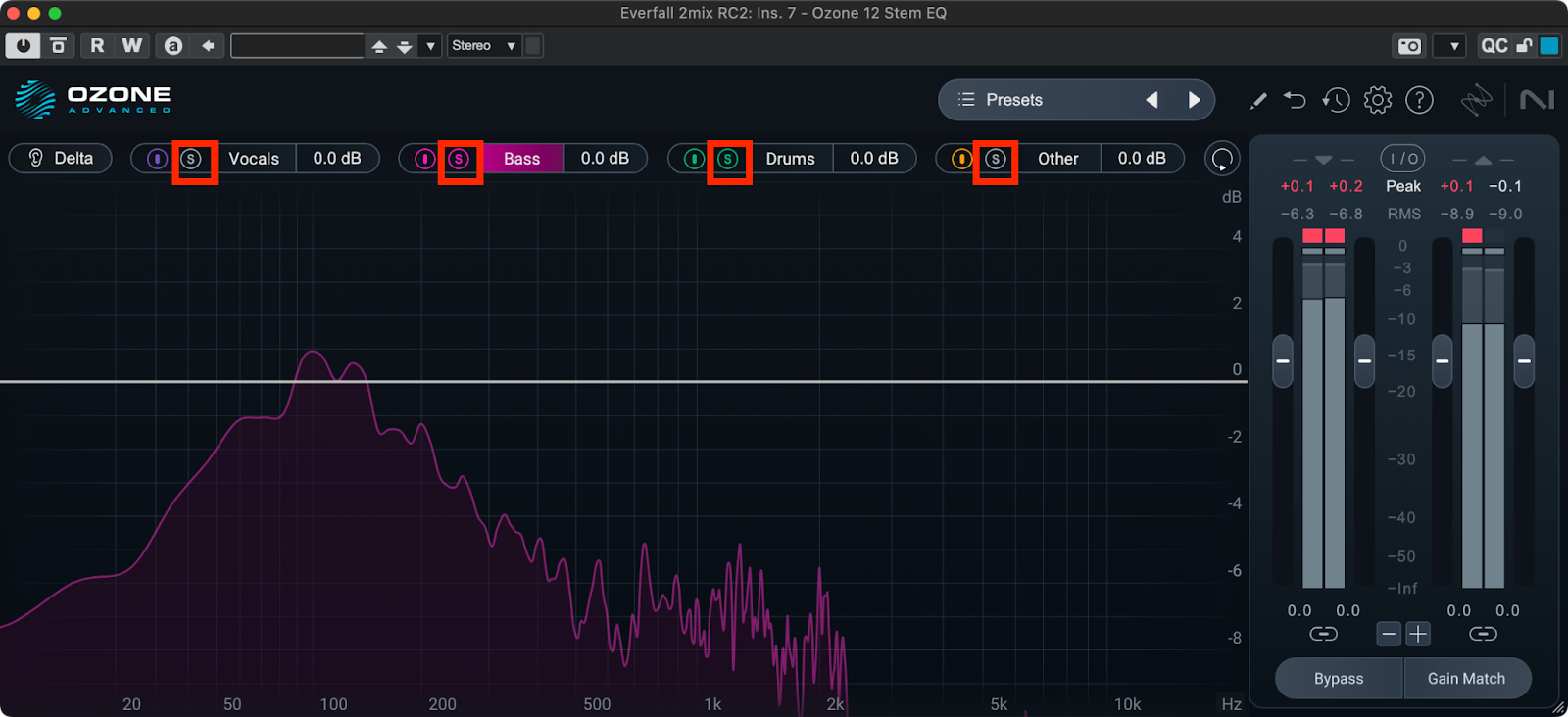 ミックス済の波形にStem EQモジュールをインサートしたら、Vocal、Bass、Drum、その他の楽器から、処理したい楽器をクリックして選んで下さい。