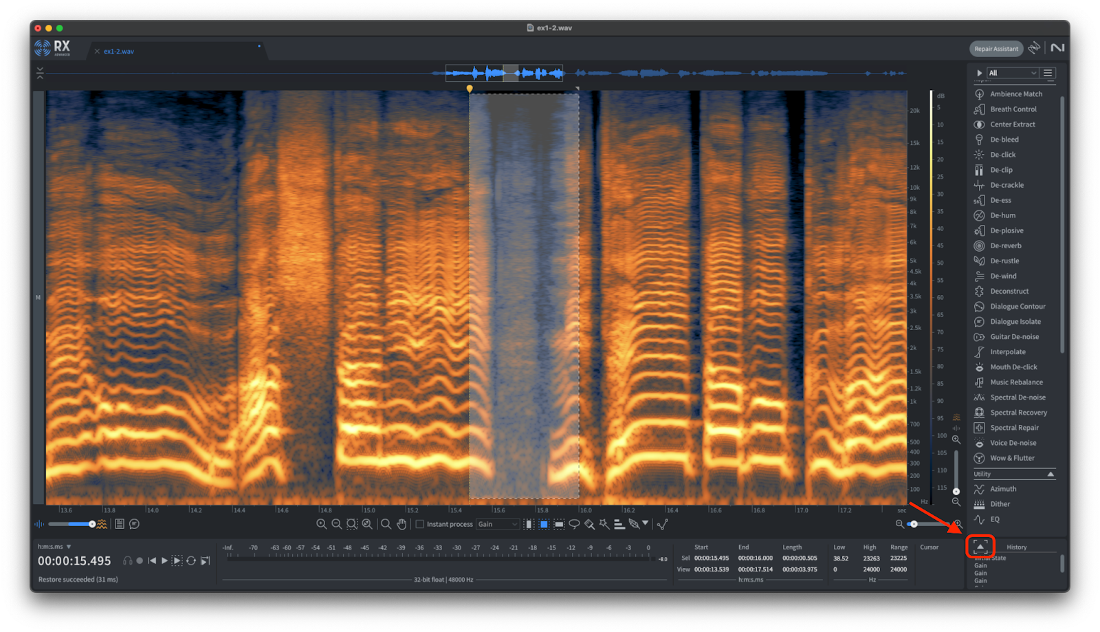 Historyの部分左側にあるアイコンをクリックすると、Historyのメニューを拡大することができます。Restore selectionとあわせて使用してみてください。