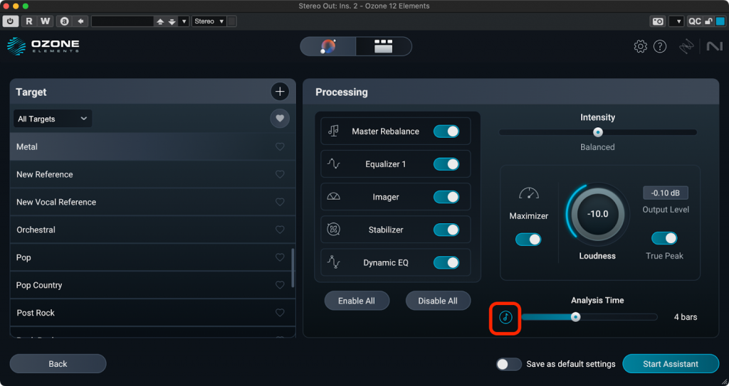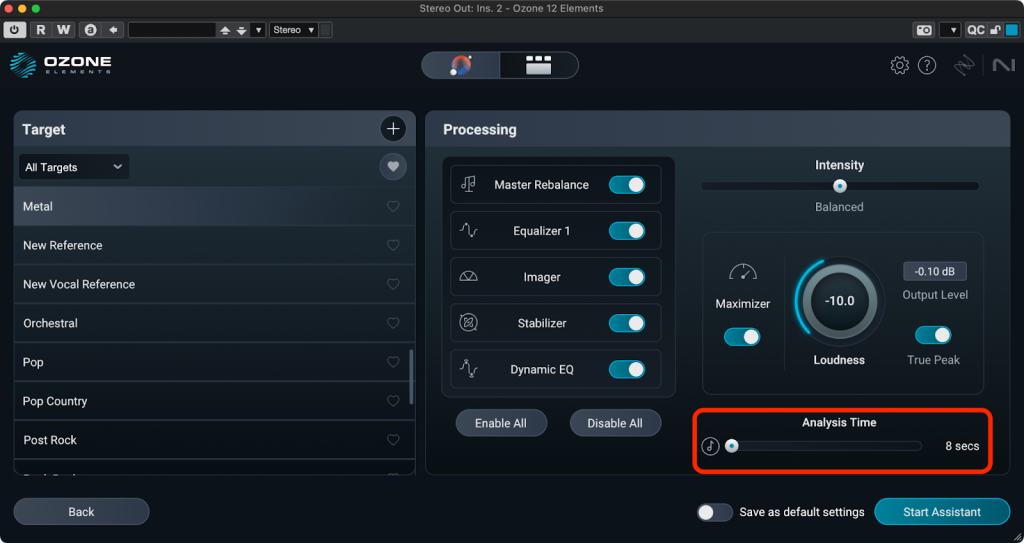 Analysis TimeはMaster Assistantに楽曲を学習させるために教材として聴かせる楽曲の尺の長さです。デフォルトでは8秒ですが、最大60秒まで伸ばすことで、より平均的な楽曲のキャラクターを考慮してマスタリングを提案させることができます。