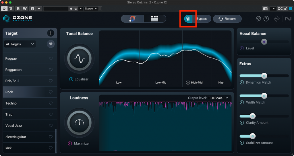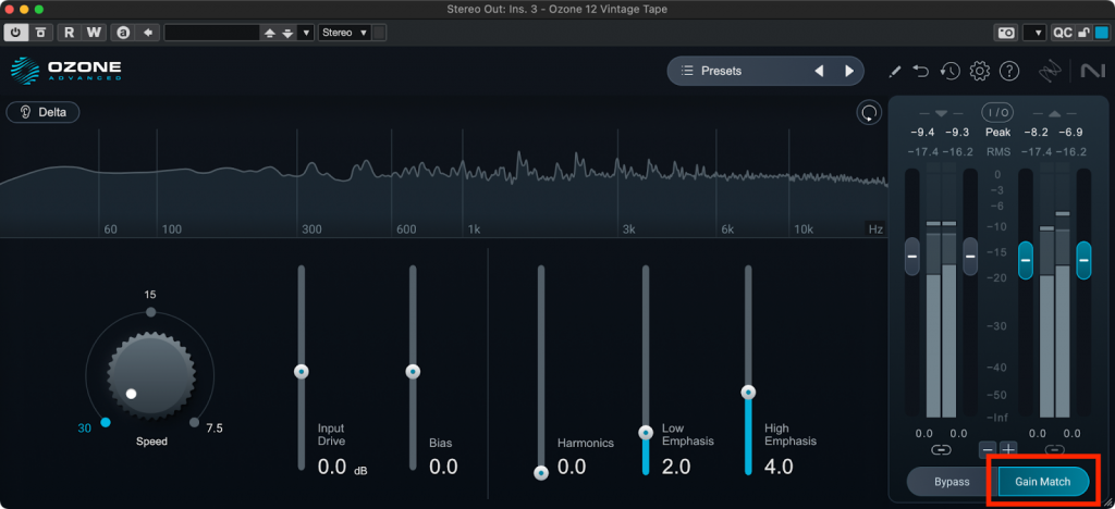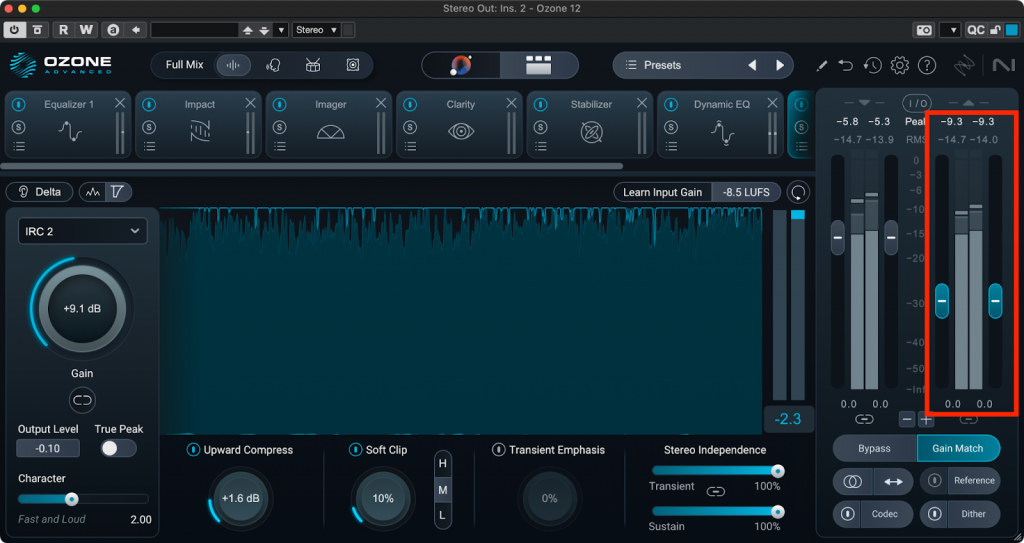 OzoneにはGain Matchという機能がついていて、これを有効にしておくとOzoneで処理した後の信号の音量をOzoneに入ってきた信号の音量と揃えてくれます。Master Assistantの画面だとGain Matchはここにあります。