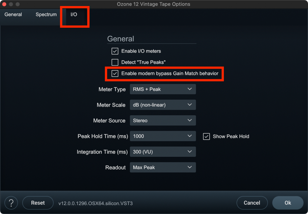 更にOzoneのGain Matchにはもうひとつのモードがあり、バイパスした時の信号の音量をOzoneで処理した信号の音量に揃えてることができます。歯車アイコンで設定画面を開きI/Oタブに移動したらEnable modern bypass Gain Match behaviorのチェックを外せばOKです。