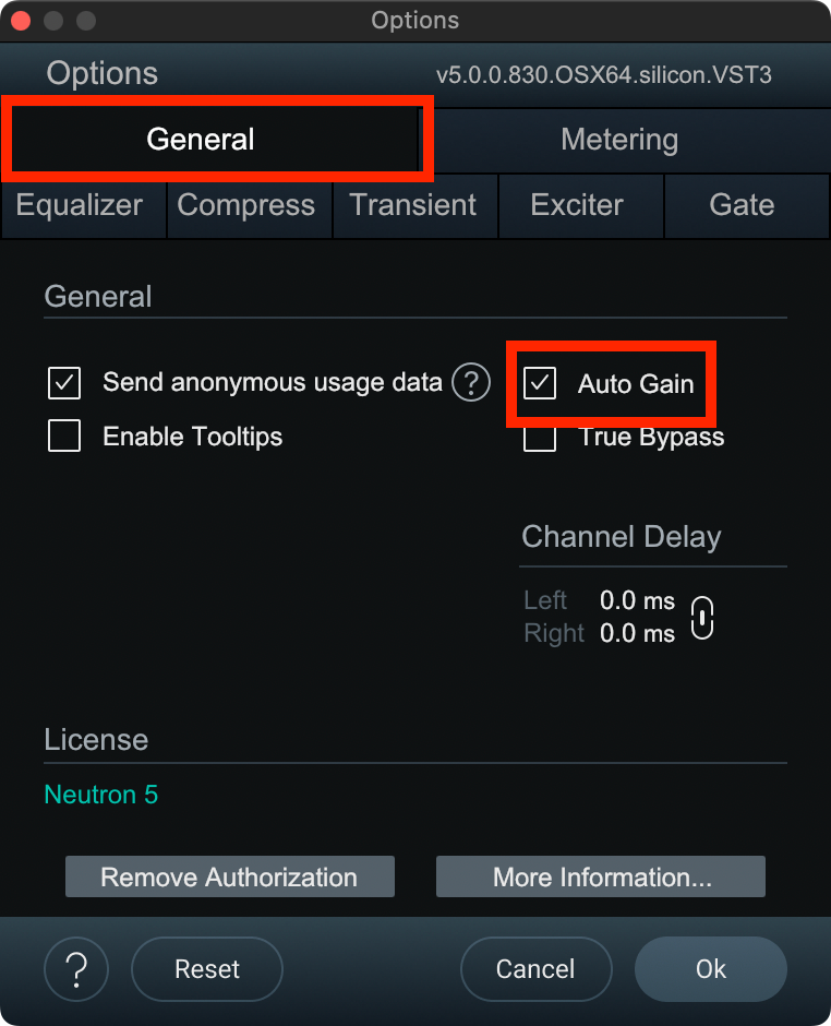 Neutronではどうでしょうか。Neutron 5では、歯車アイコンをクリックしてGeneralタブの中にあるAuto Gainのチェックボックスにチェックを入れると、Neutronをバイパスした時の信号の音量が、Neutronで処理された後の信号の音量に揃えられます。