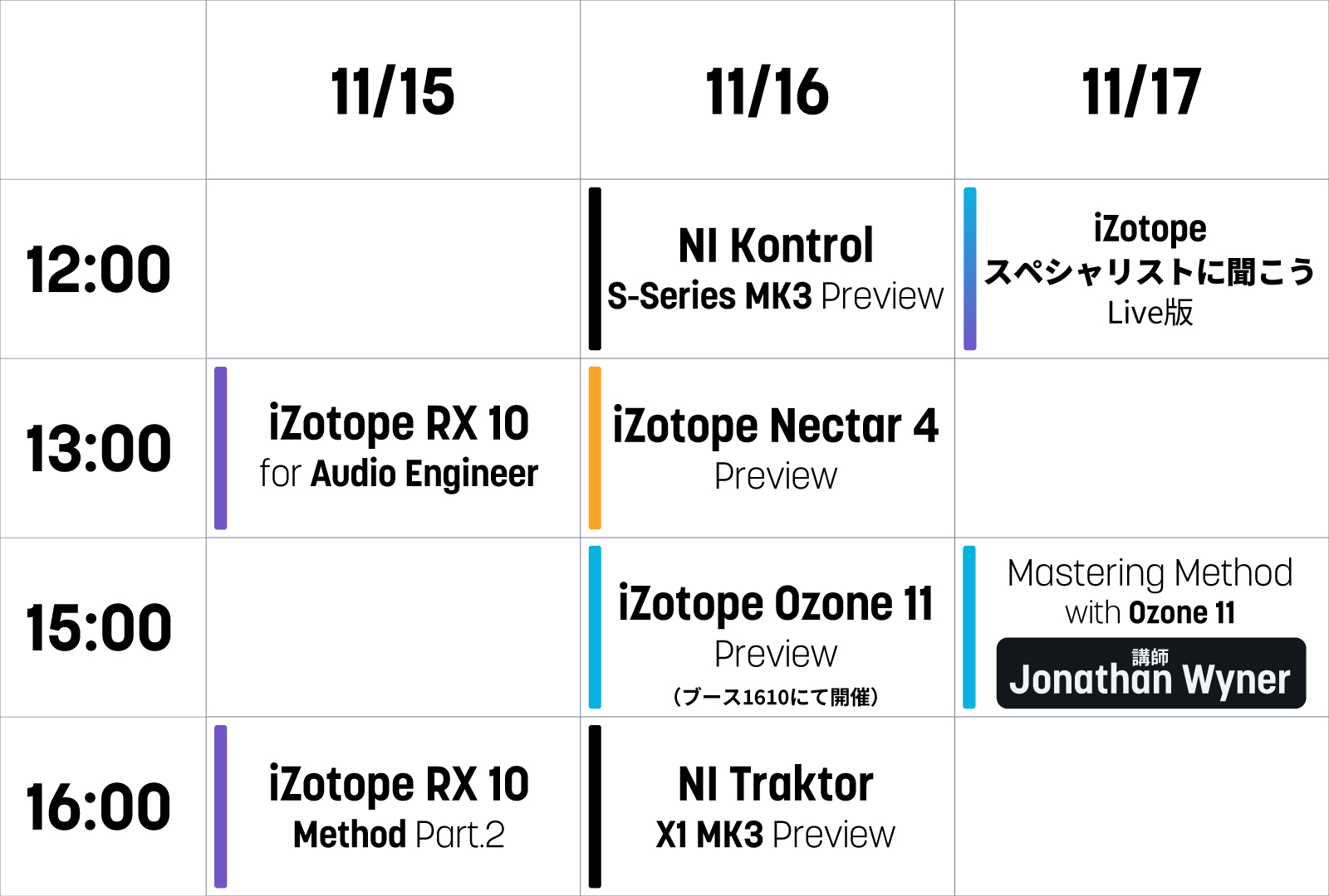 開催期間中はiZotopeアーティスト青木 征洋氏、ポストプロダクションスペシャリスト牧瀬 能彦氏、そしてマスタリングエンジニア Jonathan Wyner氏による講義を予定しております。