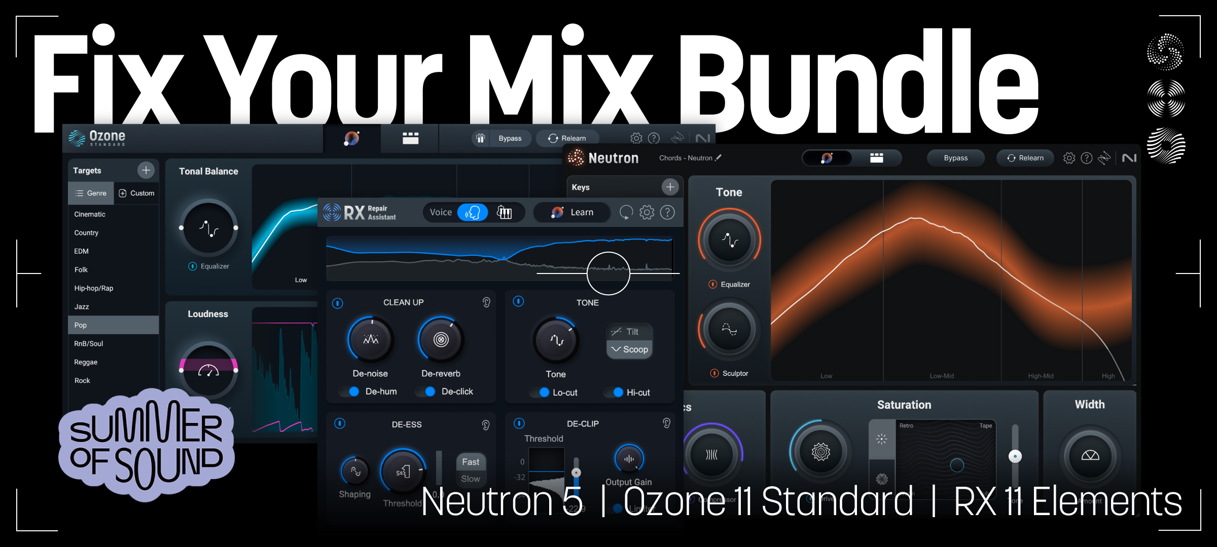 Fix Your Mix BundleはNeutron 5、Ozone 11 Standard、RX 11 Elementsを厳選収録した、Summer of Sound 2025開催期間限定の特別なバンドルです。
