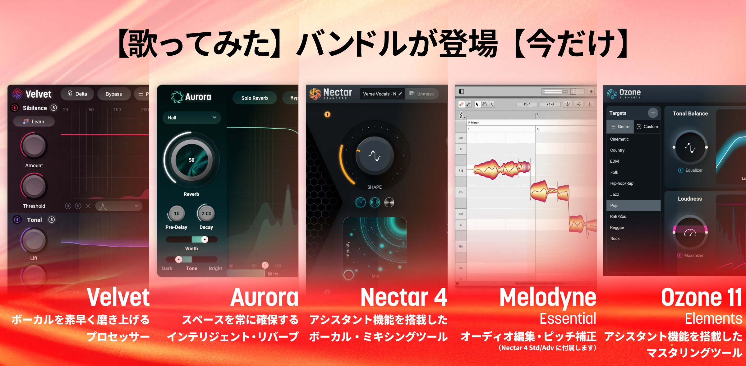 歌を濁さずに響かせる魔法のリバーブAuroraや、ボーカルアシスタントA.I.や各種ツールを含むNectar (Standard/Advanced)、ピッチ補正のMelodyne Essentialなどで構成。