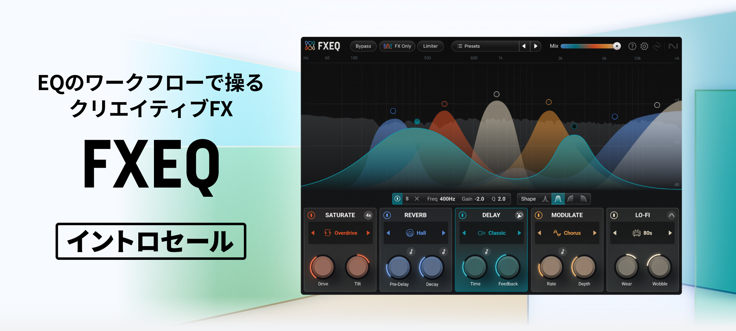 FXEQは、ドライブ/奥行き/質感を思いのままに加えられる5種類の強力なクリエイティブ・エフェクトを革新的な”EQワークフロー”で自由自在に操作することができます。
