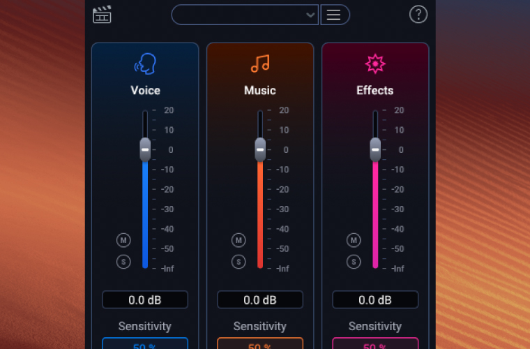 複雑な映画やテレビの最終ミックスを、詳細な編集やレベル調整のために、『セリフ、BGM、エフェクト(その他)』にインテリジェントに分離します。ポストプロダクション専用に開発されたこの新機能により、バランスを微調整する時間を節約でき、ステムなしで編集している時には”命の恩人”となることでしょう。