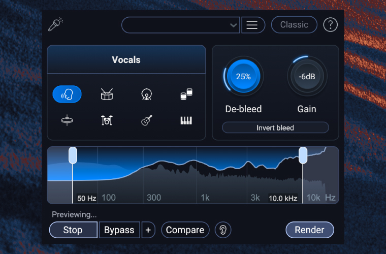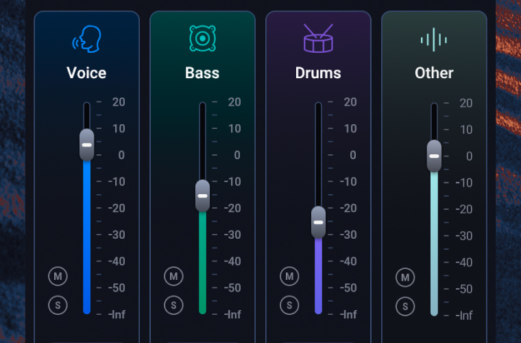 信号間の干渉を低減します。最先端の機械学習を用いて再構築され、ドラム全体からスネア、タム、シンバルなどパート単位の分離、さらにボーカル、ギターやピアノにもアクセス、より高い精度と優れた結果を実現します。参照用に「bleed(混入元の信号)」トラックをアップロードする必要もなくなりました。
