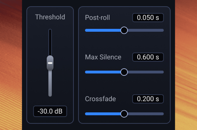 沈黙の時間が多いファイルに対し、スレッショルド設定のみで長いオーディオファイル内の無音部分を検出して削除し、時間のかかる面倒な編集作業を排除します。ポッドキャストやフィールドレコーディング、長時間インタビューなどの音声編集に効果を発揮します。