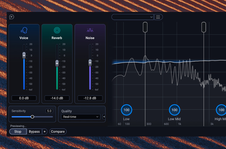 セリフやボーカルのノイズ除去およびリバーブ除去を行います。最先端のニューラルネットワークを搭載し、リアルタイムモードとオフラインモードの両方で精度が向上しました。