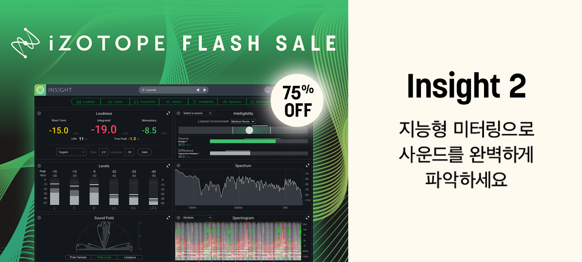 믹싱, 마스터링, 방송, 포스트 프로덕션에 최적화된 전문 오디오 메터링 플러그인 Insight 2 플래시 세일을 안내드립니다.