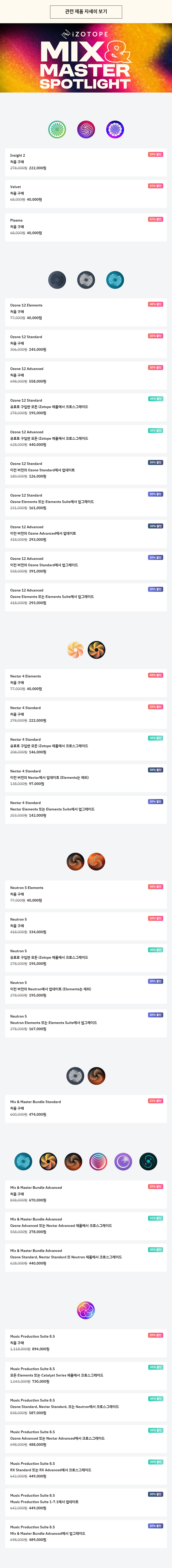 Ozone 12, Neutron 5, Nectar 4, Insight 2를 비롯해 Mix & Master Bundle 시리즈, Music Production Suite 8.5, Ozone / Neutron / Nectar의 Elements 제품, 일부 Catalyst Series 제품이 세일 대상에 포함됩니다.