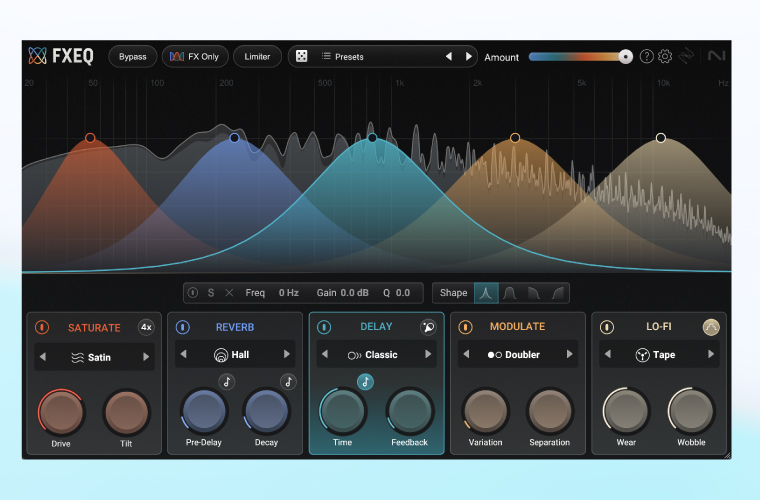 FXEQ로 사운드에 색을 입히세요. 5가지 강력한 크리에이티브 이펙트로 드라이브, 공간감, 텍스처를 손쉽게 추가할 수 있습니다. 새츄레이션으로 사운드를 전기처럼 살아나게 하세요. 텍스처로 로우파이한 빈티지 감성을 더하세요. 코러스, 플랜저, 페이저, 리버브, 딜레이로 깊이와 움직임을 부여하세요. 고유한 조합과 오토메이션으로 어떤 사운드든 완전히 새롭게 변형시킬 수 있습니다. 복잡한 라우팅, 버스, 센드는 이제 그만. 묵직한 베이스부터 크런치한 드럼, 몽환적인 신스까지, 필요한 곳에 창의성을 더하는 것이 그 어느 때보다 쉬워졌습니다.