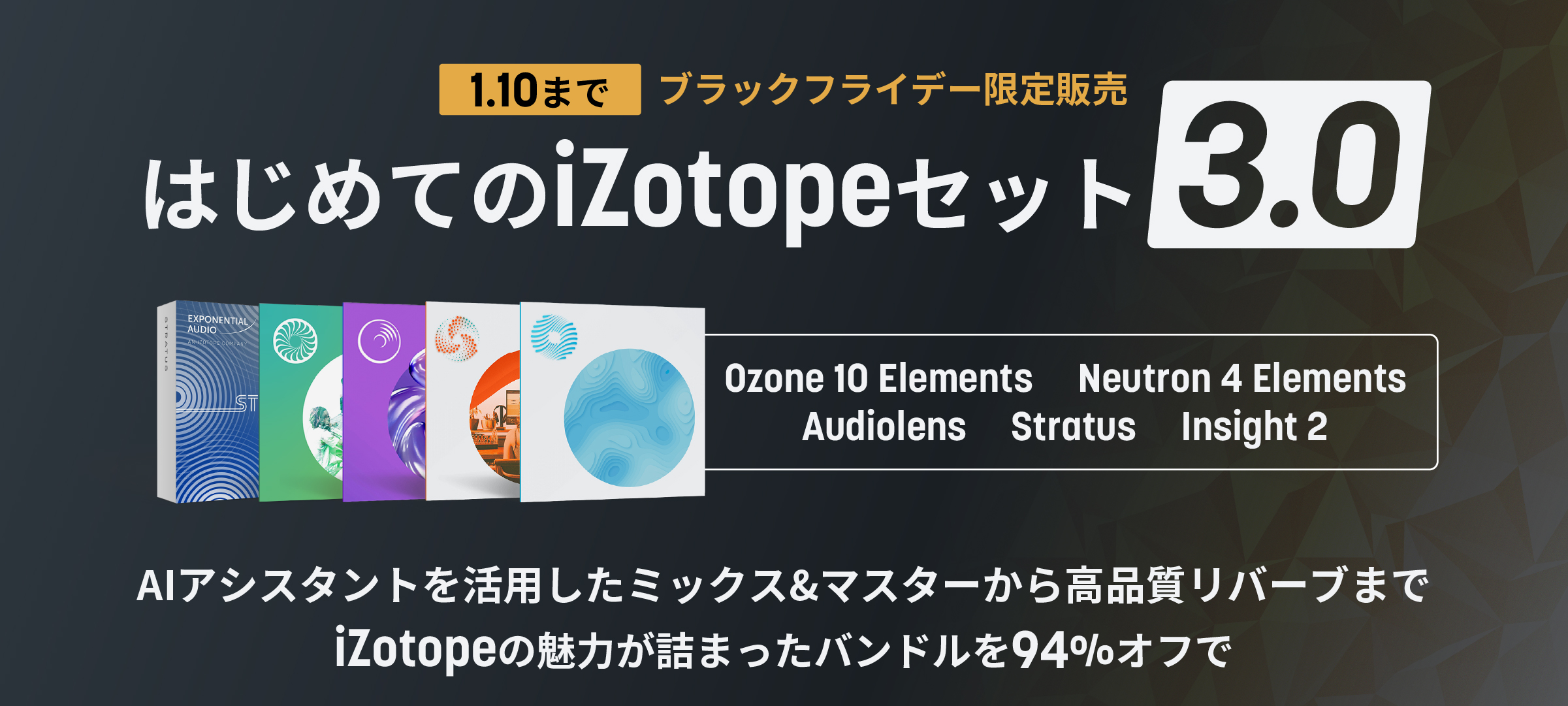 2023年1月10日まで開催しているブラックフライデー&iZotope円高差益還元プロモーション期間中限定で、iZotopeの魅力的な製品をお得な価格で詰め込んだ『はじめてのiZotopeセット3.0』を販売しております。