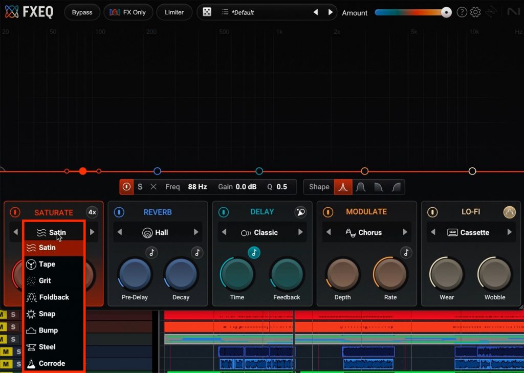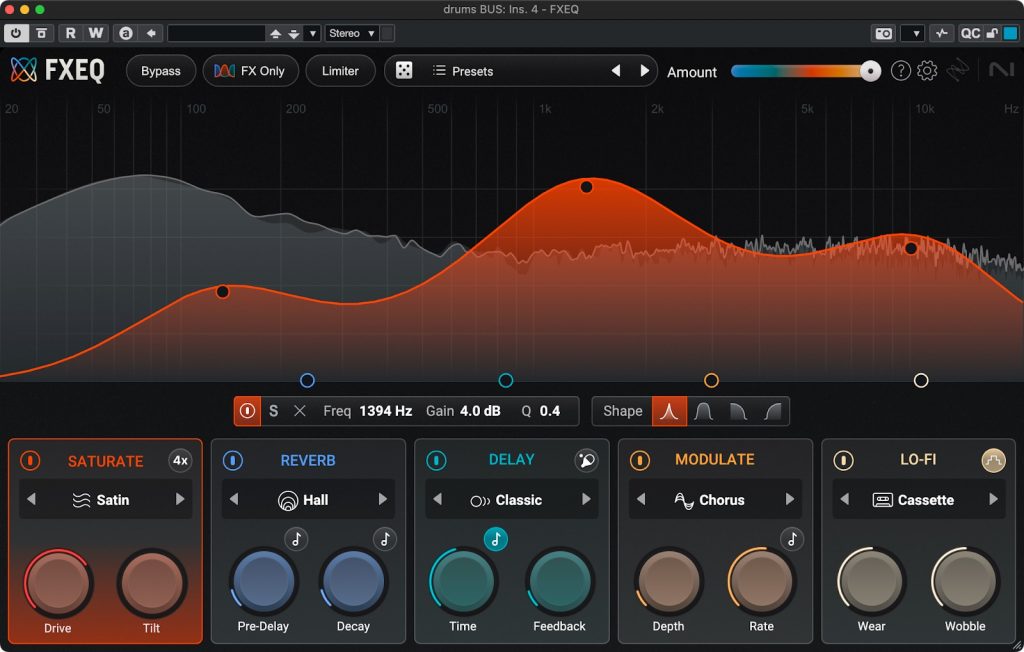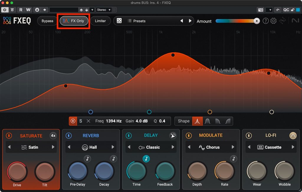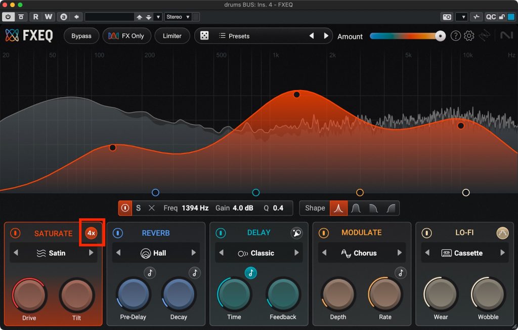 FXEQは全帯域に対して一斉に歪みを加えるわけではなく、まるでEQをかけるように特定の帯域のみに歪みを足していく感覚でかけることができます。