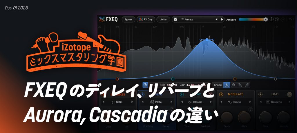 iZotopeのCatalystシリーズにはAuroraというリバーブとCascadiaというディレイプラグインがある一方で、FXEQにもリバーブとディレイが入っていて「これは結局どっちを買うのがオトクなの?」と疑問を持たれている方もいらっしゃるかもしれません。使い方の違いを理解することで、その疑問を解消してみたいと思います。