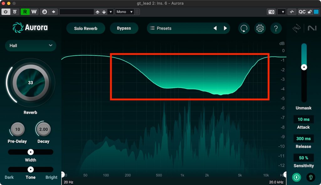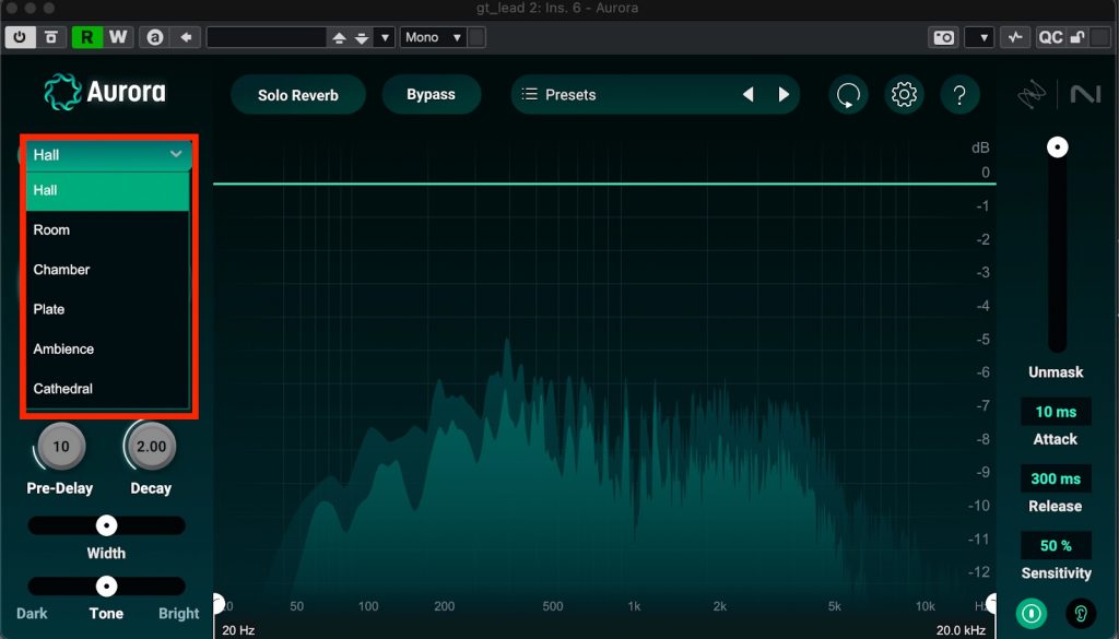 他にもAuroraではリバーブ成分のステレオ幅を広げたり狭めたりすることができます。更に、Auroraのユニークな機能としてUnmaskがあります。これは特にリバーブをしっかり深めにかけたい時に便利な機能で「ドライとリバーブ成分が干渉してマスキングしあっている時に、干渉が起きている帯域のリバーブ成分を、その瞬間だけカットするという動的な処理です。