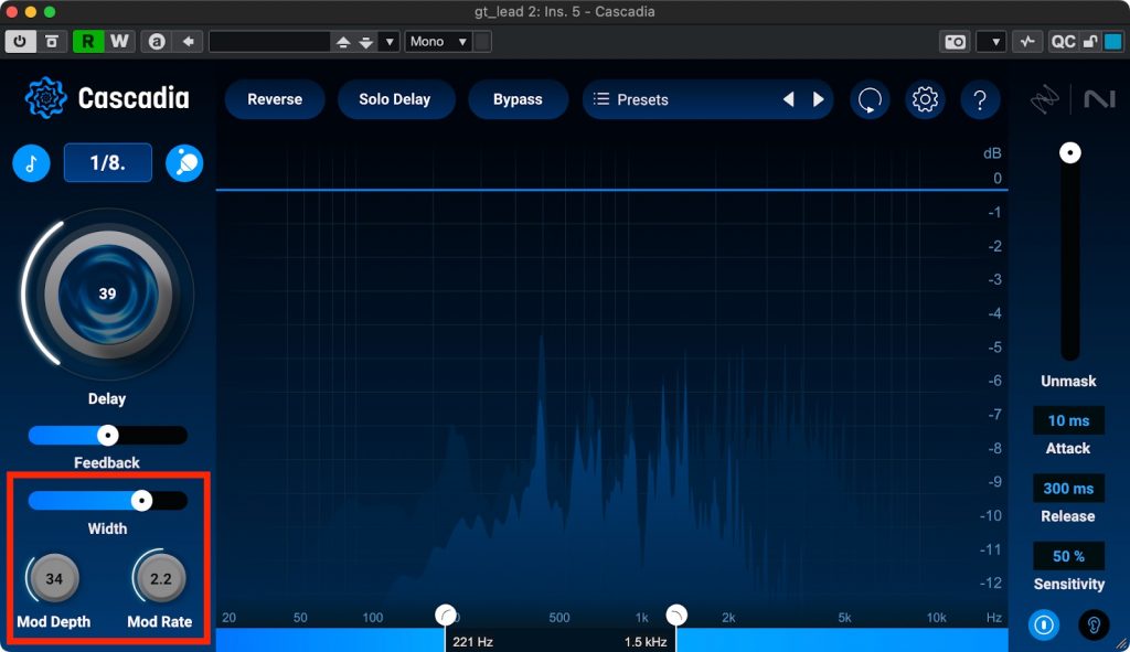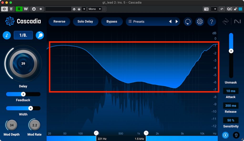 更に、CascadiaにはAurora同様Unmask機能があるため、ディレイがドライ成分を邪魔している瞬間だけ抑え込むことができます。つまり、深いけど濁らないディレイを簡単にデザインできます。
