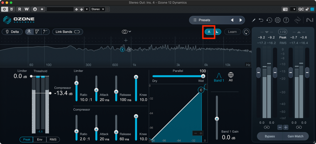NeutronのCompressor、OzoneのDynamicsにおいてはマルチバンド処理にした際にAuto Gainを有効にした場合それぞれのバンドに対し自動的なゲイン補正量が個別に計算されます。つまり、例えば低域だけにコンプレッションをかけていた場合Auto Gainで補正されるのは低域のみとなります。