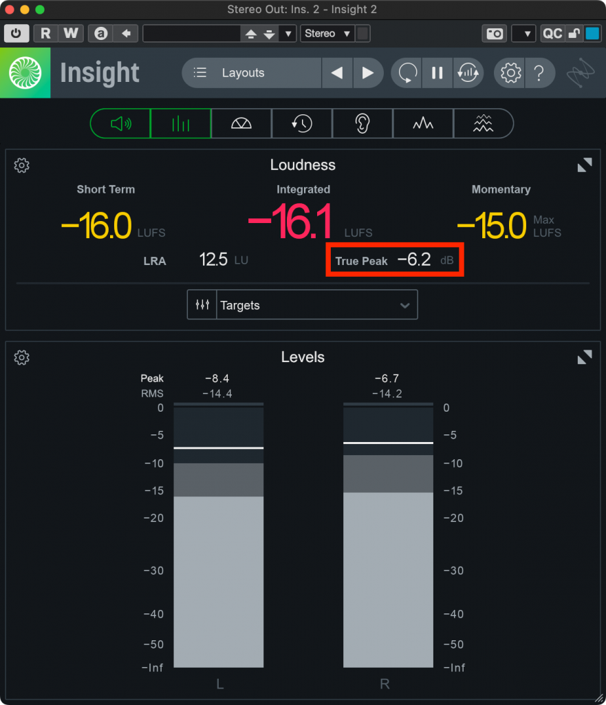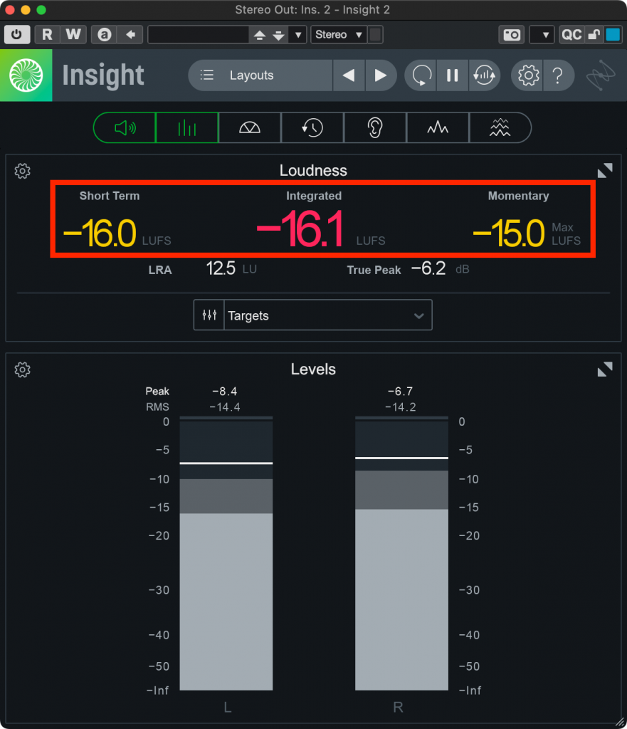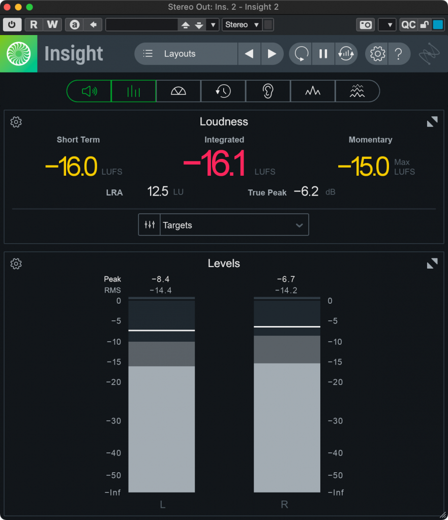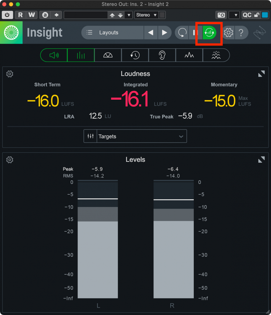 Insight 2はもちろんこれだけではありません。赤い部分をクリックしていくことでツールが追加で表示され、ステレオイメージの広がりやラウドネスの時間変化、スペクトラム等より高度なメータリングをすることができます。慣れてきて興味が湧いた方は是非、Insight 2でどんな情報を可視化することができるのか試してみて下さい。