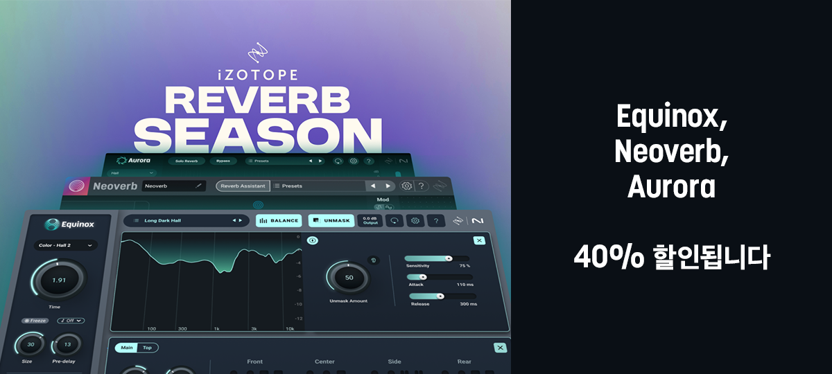 공간을 만드는 리버브, Reverb Season 세일을 안내드립니다. 믹스에 깊이와 감정을 불어넣는 공간감. 이번 Reverb Season 세일에서는 iZotope의 대표 리버브 플러그인 3종을 40% 할인된 가격에 만나보실 수 있습니다. 기간: 2025년 10월 30일까지 대상 제품: Aurora, Neoverb, Equinox 본 할인에 대한 더 자세한 사항은 아래의 공식 대리점에서 확인 및 문의하실 수 있습니다.
