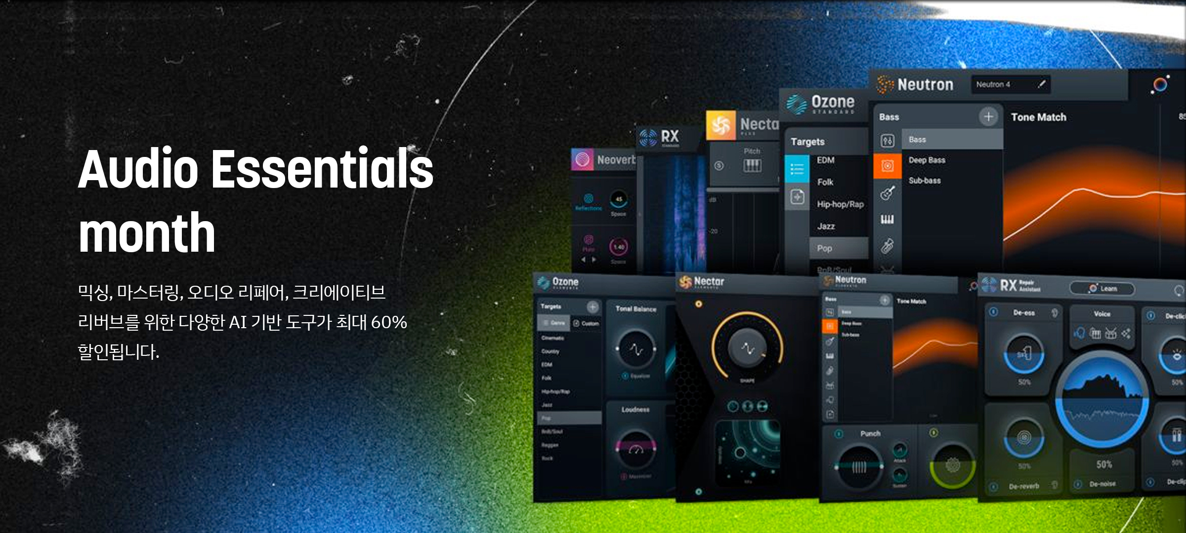Audio Essentials Month 세일 기간 동안, 믹싱, 마스터링, 오디오 리페어, 크리에이티브 리버브를 위한 다양한 AI 기반 도구가 최대 60% 할인됩니다.
