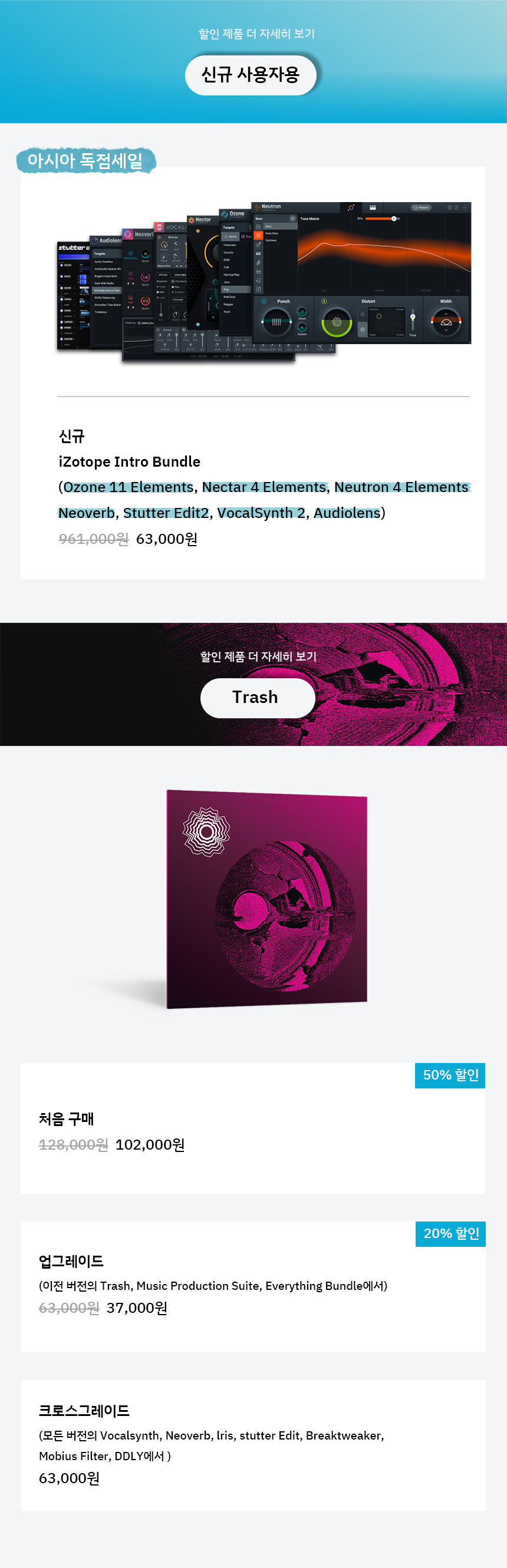 iZotope 51 Labor Day Sale이 진행됩니다! 이번 프로모션은 아시아 한정으로 진행되며, 한정 수량의 iZotope Intro Bundle 특별 판매 및 Trash 처음 사용자용 본품, 업그레이드, 크로스그레이드가 모두 할인됩니다.